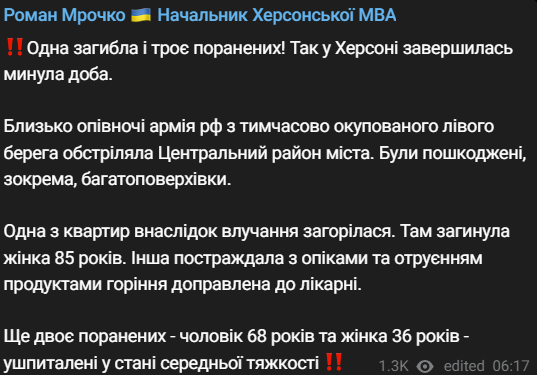 Вночі російські війська завдали удару Центральному району Херсона. Внаслідок обстрілу одна загибла та троє поранених, пошкоджено багатоповерхові будинки.