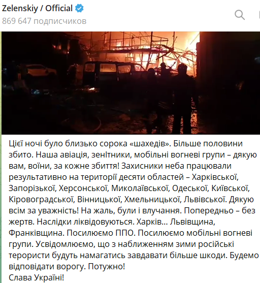 "Наслідки усуваються. Харків... Львівщина, Франківщина. Підсилюємо ППО. Підсилюємо мобільні вогневі групи. Усвідомлюємо, що з наближенням зими російські терористи намагатимуться завдавати більше шкоди. Відповідатимемо ворогові. Потужно!" – написав президент.
