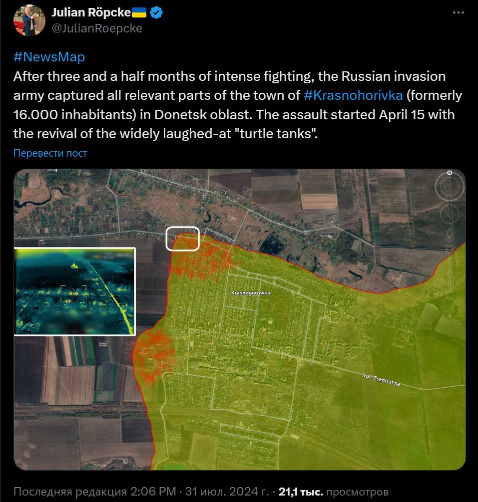 "Після трьох з половиною місяців інтенсивних боїв російська армія вторгнення захопила всі відповідні частини міста Красногорівка (раніше з населенням 16 000 жителів) у Донецькій області. Наступ розпочався 15 квітня з відродження "танків-черепів", що широко обговорювалися, - написав він і опублікував карту.