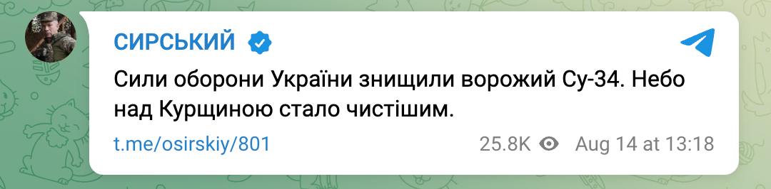 Тим часом Сирський у своєму телеграм-каналі повідомив, що ЗСУ збили російський винищувач Су-34. Він натякнув, що це сталося у Курській області.