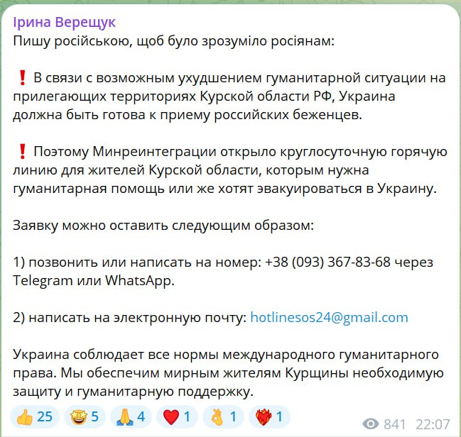 Віце-прем'єр Ірина Верещук опублікувала номери гарячої лінії та адресу електронної пошти для біженців з районів Курської області, що знаходяться під контролем ЗСУ.