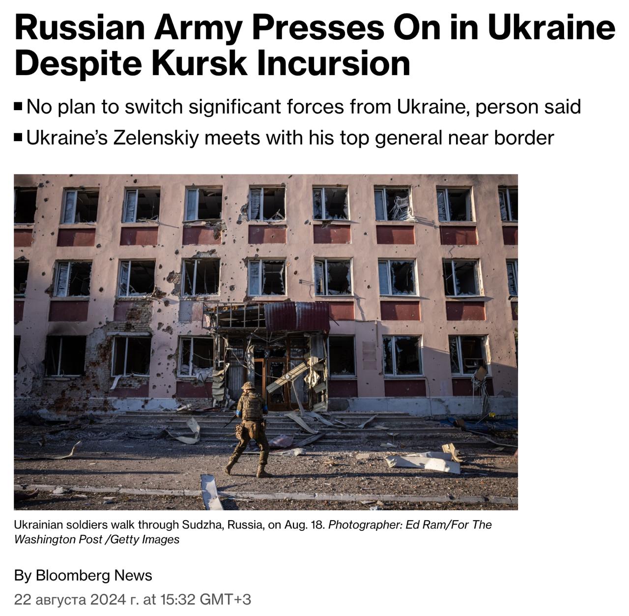 10:58 РФ вирішила не перекидати значні сили з Донбасу до Курської області, повідомляє Bloomberg з посиланням на джерело, близьке до Кремля.