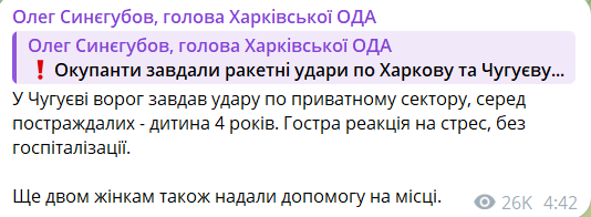Голова Харківської ОВА Олег Синегубов повідомив, що постраждали чотири особи, серед них – дитина 4 роки. Він має гостру реакцію на стрес, без госпіталізації.