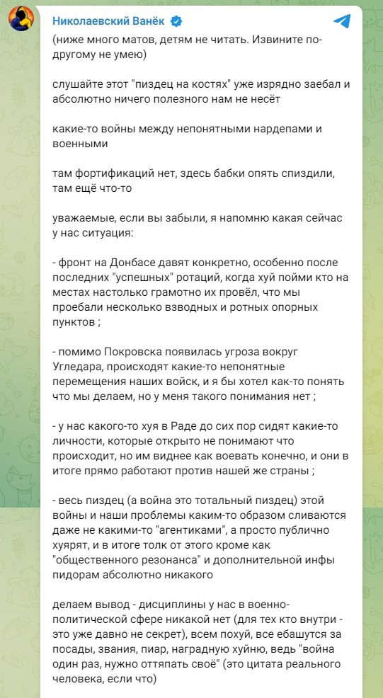 Про це з великою кількістю нецензурної лексики написав відомий український військовий телеграм-канал "Миколаївський Ваньок".