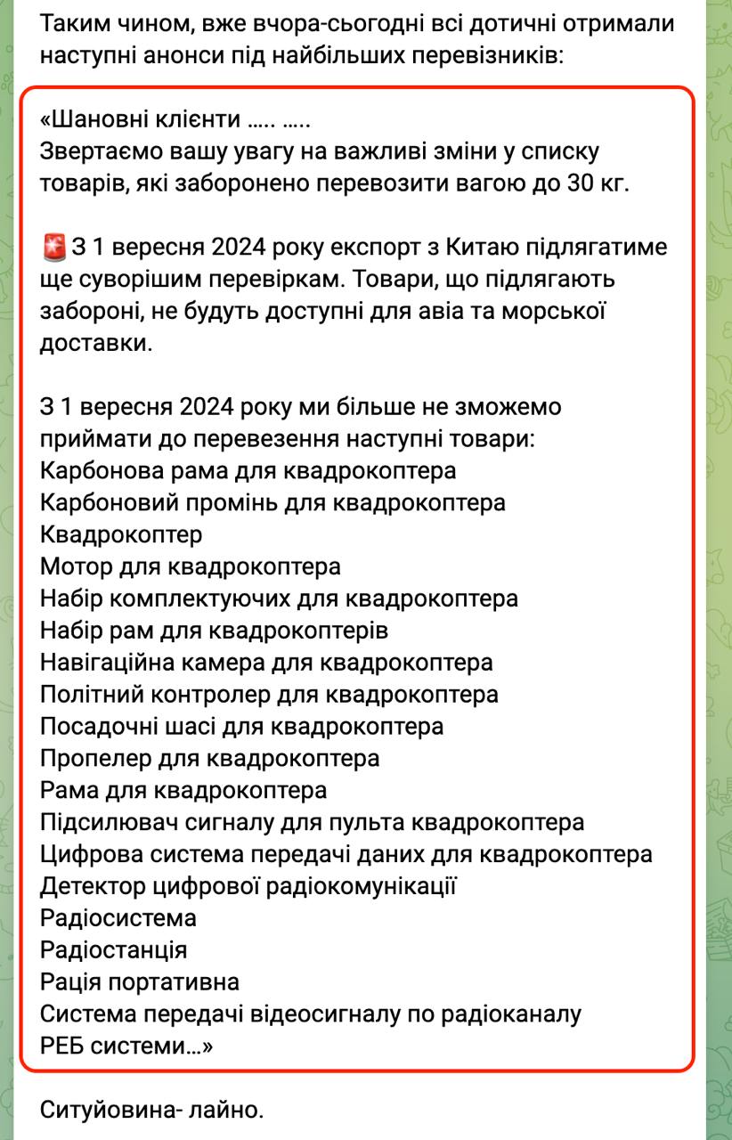 Йдеться про обмеження на вивезення з КНР цілої низки компонентів для збирання БПЛА. Він зазначає, що українські дрони збираються повністю із китайських комплектуючих.