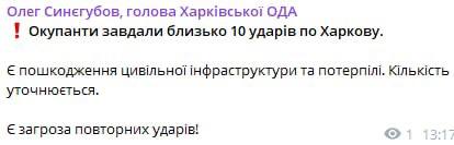 13:21 Росіяни завдали Харкова близько 10 ударів, є пошкодження цивільної інфраструктури та потерпілі. Їхня кількість уточнюється, повідомив голова ОВА Олег Синегубов. За його словами, є загроза повторного обстрілу.
