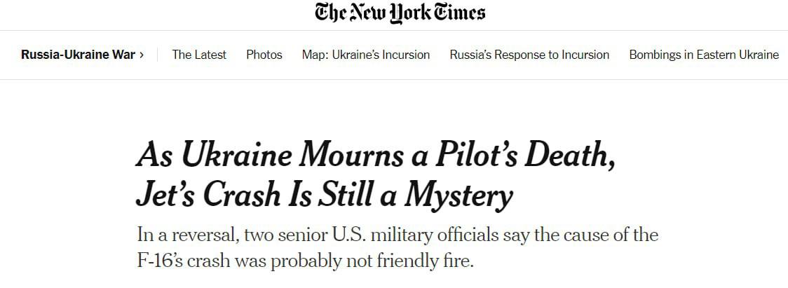 "Два високопоставлені американські військові чиновники заявили, що дружній вогонь, ймовірно, не був причиною збиття F-16, і що американські та українські слідчі розглядають різні можливості. Вони можуть включати такі речі, як механічна несправність або помилка пілота", - йдеться у статті..