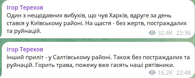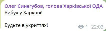 22.05 Про вибух у Харкові повідомляє голова ОВВ Синегубов.