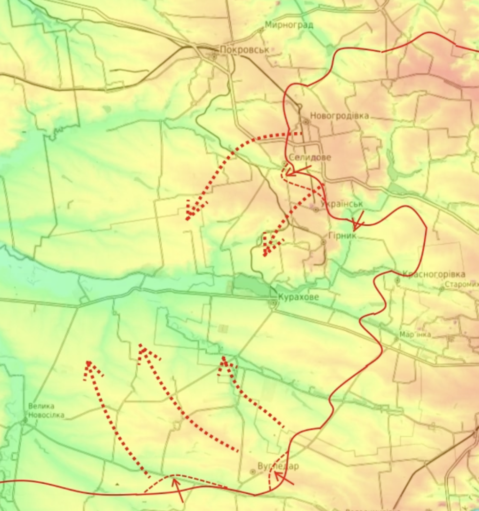 Водночас, стратегічно більш загрозлива ситуація складається для ЗСУ на захід - у районі Селидове та Новогродівки. Від цих населених пунктів, як ми вже писали, відкривається дорога на південний захід - в обхід з тилу всієї другої лінії оборони ЗСУ на захід від Донецька, яка спирається на Українку, Гірник та Курахове.