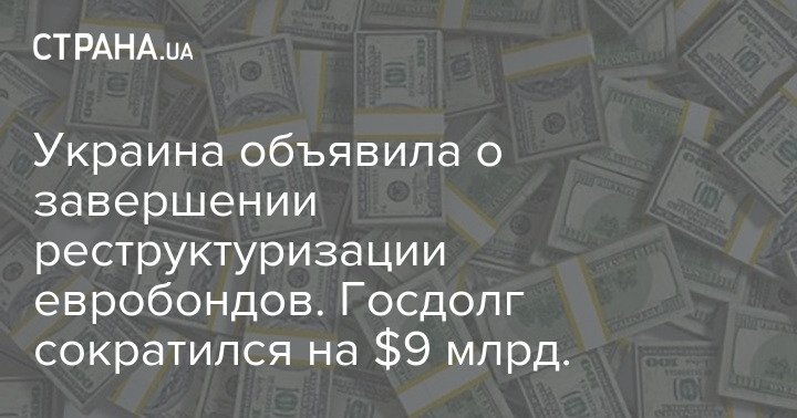 Україна оголосила про успішне завершення реструктуризації державного боргу та розрахунки з кількох серій державних єврооблігацій. Завдяки цьому держборг України скоротився майже на 9 млрд доларів.