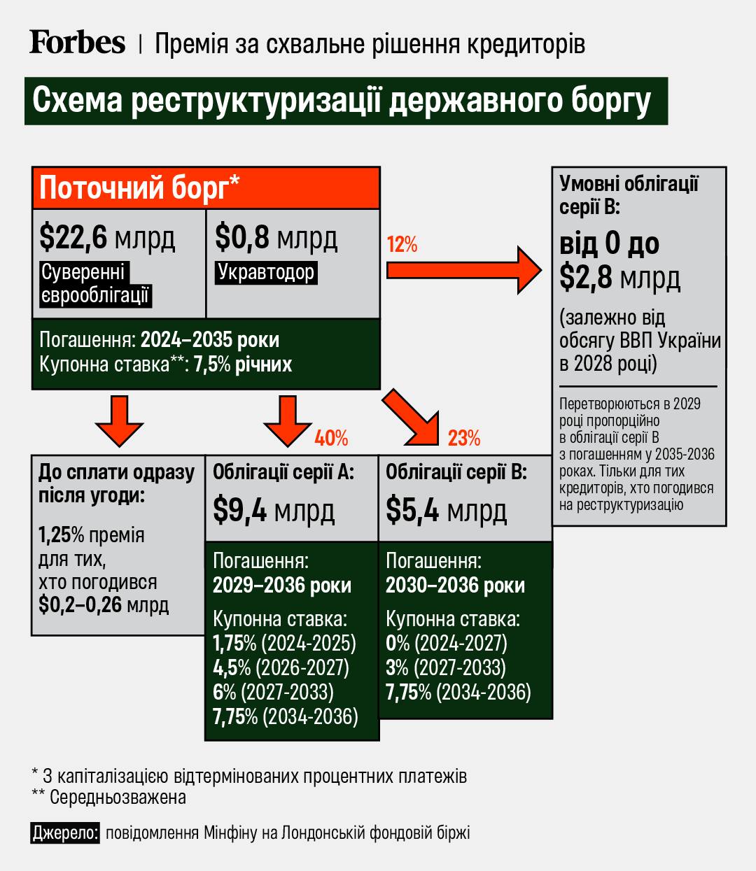 Реструктуризація включала обмін 13 серій єврооблігацій та однієї серії гарантованих державою єврооблігацій "Укравтодору" на суму близько 20,5 млрд доларів (23,4 млрд доларів з урахуванням відсотків) на вісім нових серій єврооблігацій із номінальною вартістю 15,2 млрд доларів.