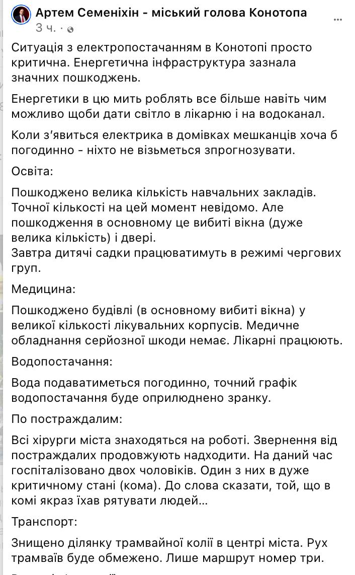 «Ситуація з електропостачанням у Конотопі є просто критичною. Енергетична інфраструктура зазнала значних пошкоджень.