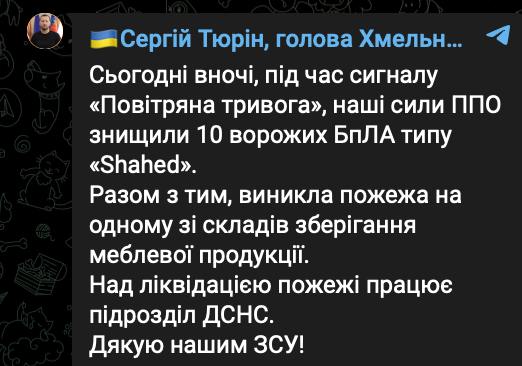 8.12 На Хмельниччині після прильоту "Шахеда" горить склад меблевої продукції, повідомила ОВА.