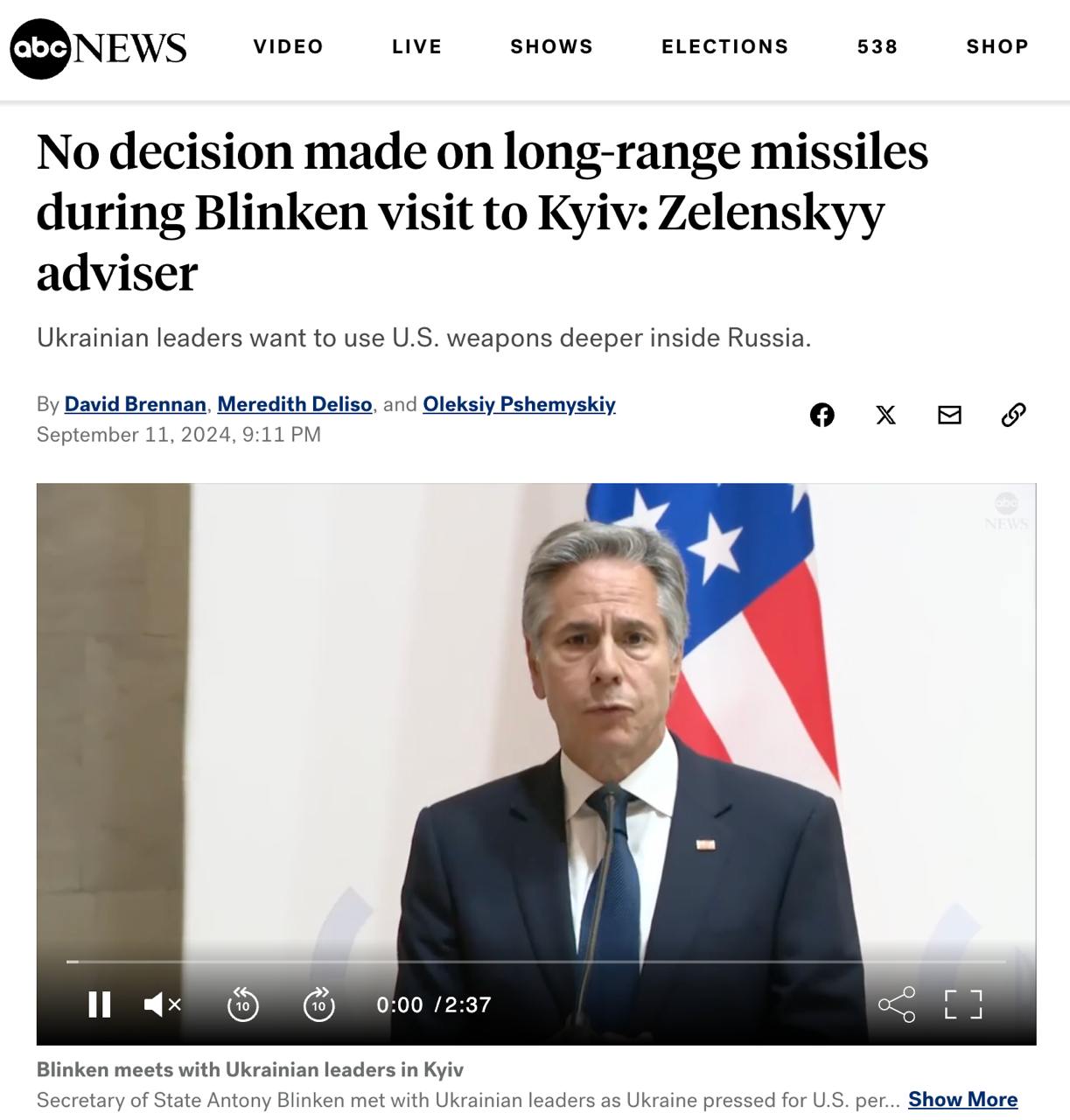 9.42 Зеленський передав Блінкену докладний план, як Україна може використовувати далекобійні ракети територією РФ, та список конкретних цілей, повідомляє ABC News з посиланням на радника президента.