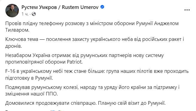 18.55 Українські льотчики розпочали підготовку на F-16 у Румунії, повідомив міністр оборони Умерів у Фейсбуці.