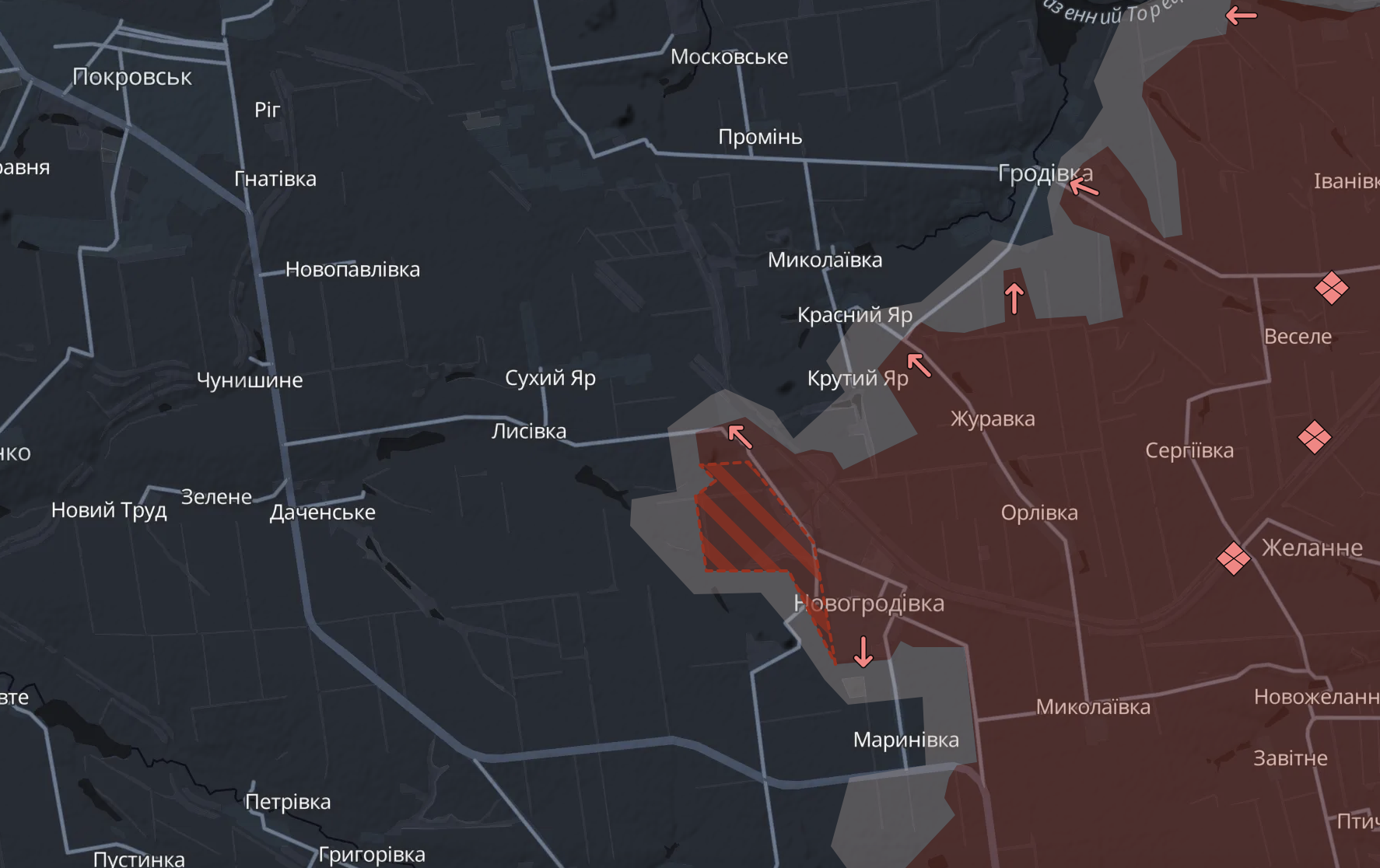 Російські війська відновили наступ у бік Покровська. Про це зі вчорашнього вечора почали повідомляти українські військові. Вони заявили, що росіяни атакували на захід від нещодавно захопленої Новогродівки та зайшли на околиці села Лисівка.