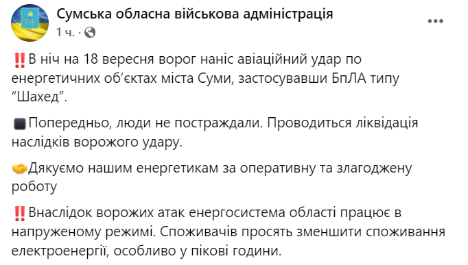 У Сумській ОВА повідомляють, що росіяни завдали авіаційного удару по енергетичних об'єктах міста Суми, застосувавши БПЛА типу "Шахед".