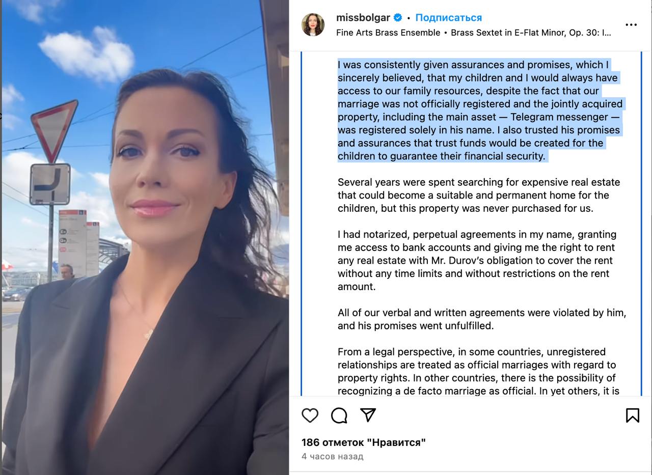 "Наш шлюб офіційно не був зареєстрований, а спільно нажите майно, включаючи основний актив – месенджер Telegram – було зареєстровано виключно на нього. З юридичної точки зору в деяких країнах незареєстровані відносини розглядаються як офіційні шлюби щодо майнових прав. В інших країнах існує можливість визнання фактичного шлюбу офіційним. По-третє, можливо претендувати на частку спільно нажитого майна відповідно до цивільного законодавства", - пише Болгар.