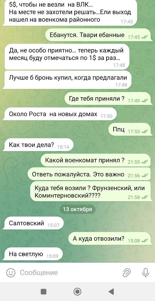 Так, один харків'янин пише, що його випустили з ТЦК за 5000 доларів, за умови виплати потім щомісяця по 1000 доларів військовому. Ще одного харків'янина випустили за 2500 доларів. "Уявіть, які суми осядуть за дні рейду? Потужно", - прокоментував цю інформацію Євген Зуб.