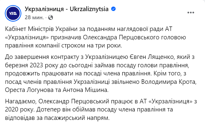 В УЗ повідомили, що Перцовський працює у них із 2020 року. Досі обіймав посаду члена правління та відповідав за пасажирський напрямок.