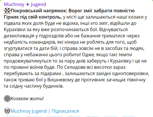 "Ворог зміг забрати повністю Гірник під свій контроль, у місті ще залишаються наші козаки у підвалі. Доля яких буде невідома, інші, хто зміг, відійшли до Курахівки, за яку вже починаються бої", - повідомив він.