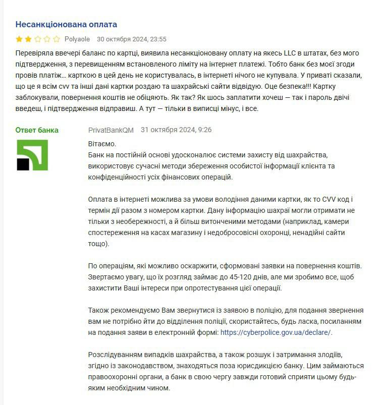 "Нам дуже прикро, що виникла така ситуація. Оплата в інтернеті можлива за умови володіння даними картки, як-от СVV-код та термін дії разом з номером картки. Цю інформацію шахраї могли отримати не тільки з необережності, але й більш витонченими методами (наприклад, камери спостереження на касах магазину та недобросовісні охоронці, ненадійні сайти тощо). За зверненням на підтримку банку можуть бути сформовані запити на оскарження операцій у міжнародній платіжній системі", - йдеться в одному з них.