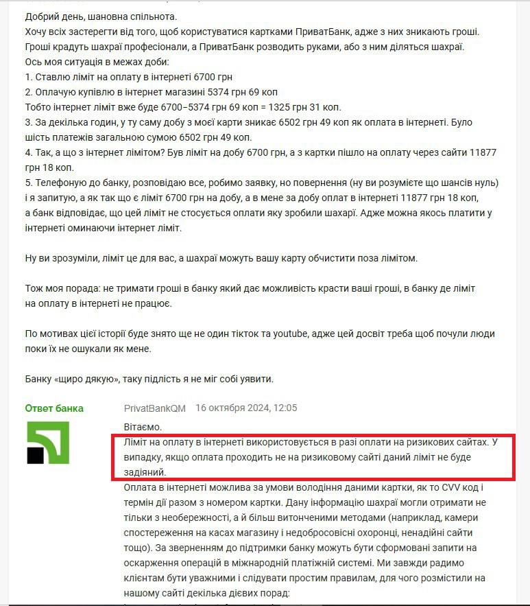 Тему перевищення свого ліміту на розрахунки в інтернеті порушив і клієнт із ніком dimitrio, який розповів, що встановив ліміт на оплати в інтернеті на рівні 6700 гривень на добу, але фактично сайт викрав із його рахунку 11 877 гривень. На це менеджер "Приватбанку" відповів повідомленням, що фінустанова застосовує ліміт не до всіх оплат у мережі, а лише до підозрілих.