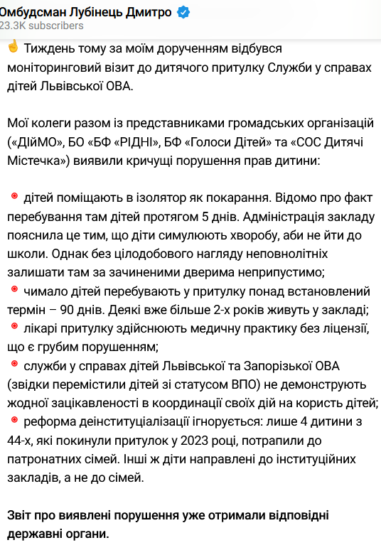 Також, за його словами, у притулку Служби у справах дітей Львівської обласної військової адміністрації багато дітей перебувають у притулку понад встановлений термін – 90 днів. Деякі вже понад 2 роки живуть у закладі, при цьому ОВА не вживає жодних заходів, щоб передати їх у прийомні сім'ї.