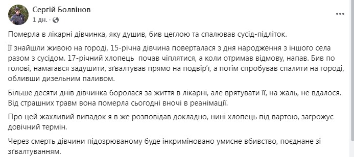 Ми також писали, що на Закарпатті троє підлітків зґвалтували 14-річну дівчинку.