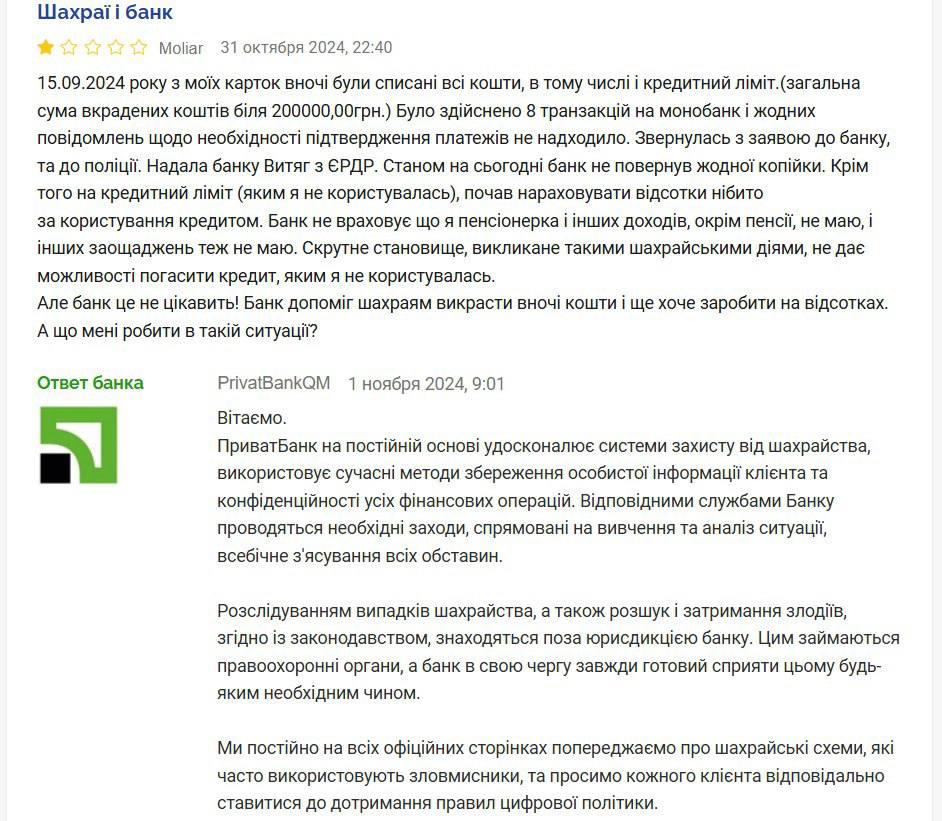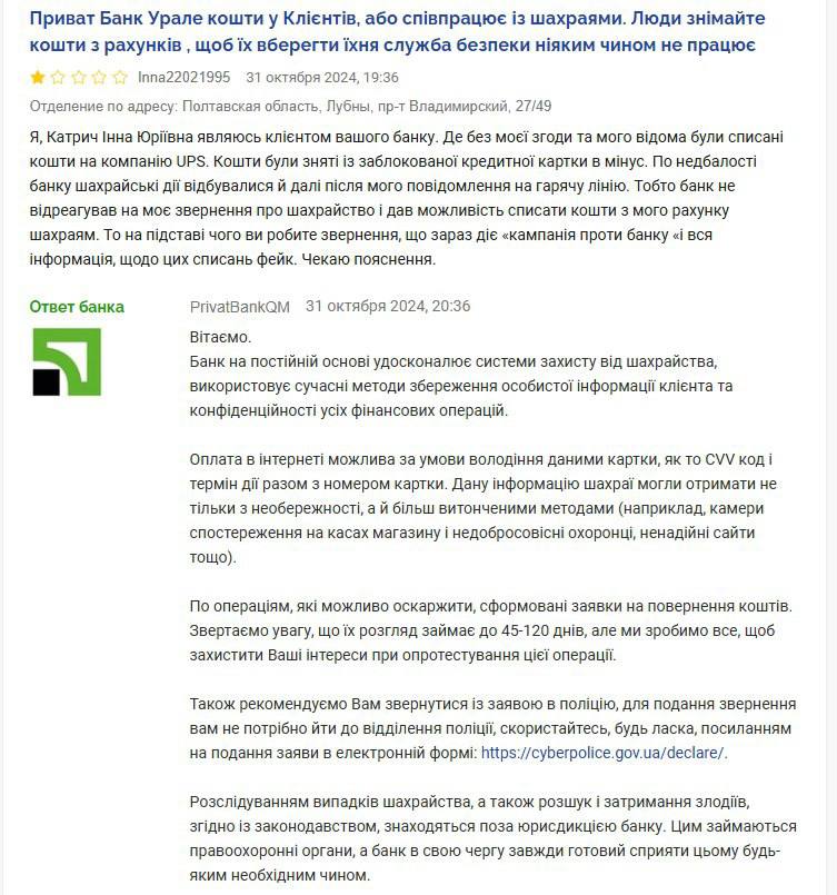 "Без моєї згоди та моєї інформації були списані кошти на компанію UPS. Кошти були зняті із заблокованої кредитної картки в мінус. За недбалістю банку шахрайські дії тривали після мого повідомлення на гарячу лінію. Тобто банк не відреагував на моє звернення про шахрайство і дав можливість списати кошти з мого рахунку шахраям", - повідомила Інна Катріч із міста Лубни.