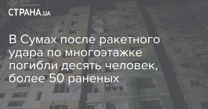 У Сумах після ракетного удару по багатоповерхівці загинули десять людей, понад 50 поранених