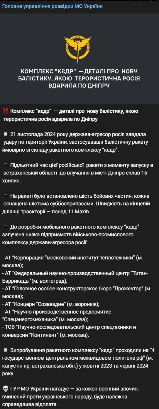 Вчора, 21 листопада, Росія вдарила по Дніпру балістичною ракетою, ймовірно зі складу ракетного комплексу "Кедр".