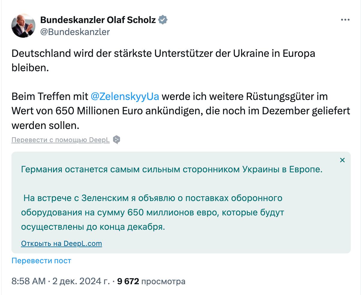 9.16 Шольц анонсував, що на зустрічі із Зеленським у Києві оголосить про пакет військової допомоги на 650 млн євро, який буде передано до кінця року.