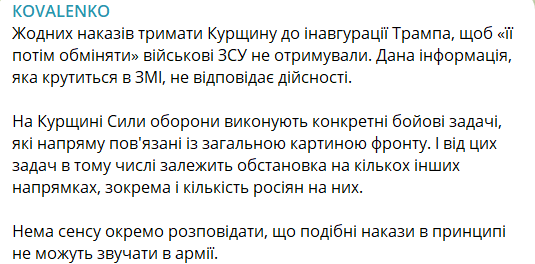 "Жодних наказів утримувати Курську область до інавгурації Трампа, щоб "її потім обміняти", військові ЗСУ не отримували. Ця інформація, що крутиться в ЗМІ, не відповідає дійсності", - стверджує Коваленко.