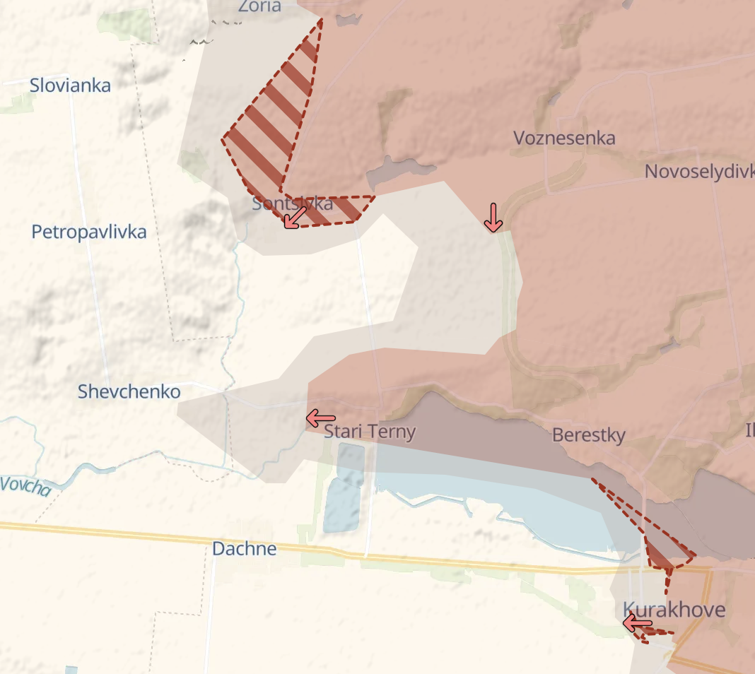 На захід від Курахового бої почалися в селі Шевченка (на захід від Старих Тернів). Також у цьому районі практично повністю захоплено Сонцовку.