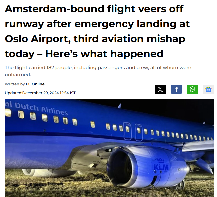 Ще одна аварія із літаком сталася сьогодні в Норвегії. Літак Boeing 737-800 авіакомпанії KLM Royal Dutch Airlines був змушений здійснити аварійну посадку в аеропорту Осло Торп Сандефіорд через несправність у гідравлічній системі.