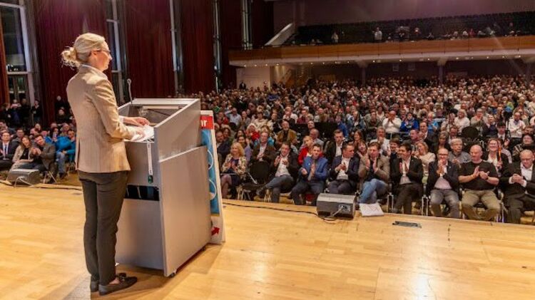 Вайдель також зірвала овації після фрази "Коли ми будемо біля керма, ми знесемо всі вітряки", маючи на увазі альтернативні електростанції.