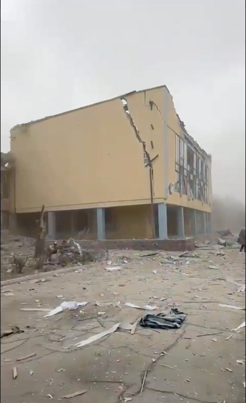 У місті пошкоджено два п'ятиповерхівки. В одній із них виникла пожежа. Крім того, понівечена будівля, що не експлуатувалася. Судячи з відеокадр, це коледж Національного авіаційного університету.