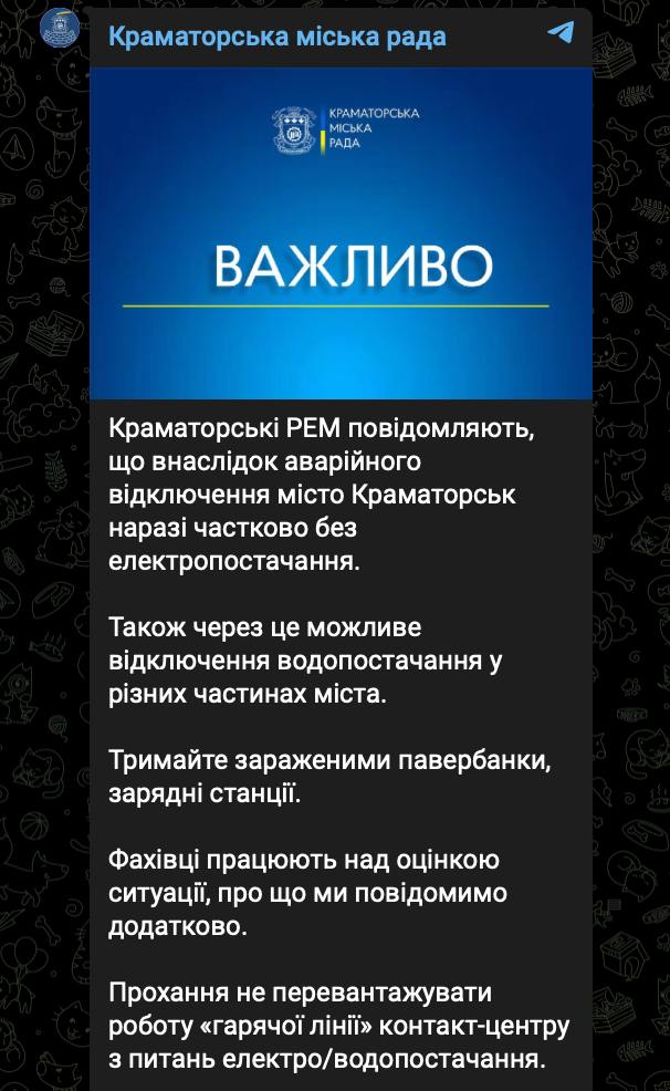 11:45 У Краматорську був приліт. У місті частково зникли світло та вода, пишуть міська влада.