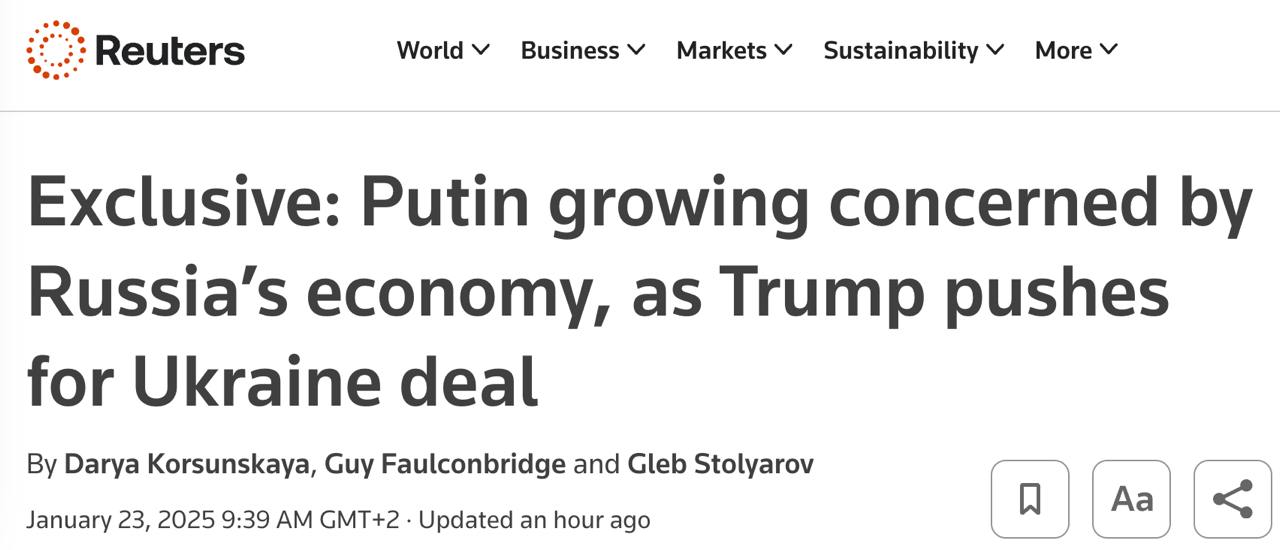 Зазначимо, учора ми публікували протилежну думку. Тетяна Станова з центру Карнегі вважає, що Путін відчуває "гордість" за стан економіки РФ в умовах війни і готовий воювати далі, якщо не побачить перспектив вигідної угоди з Трампом.