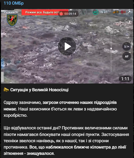 Також у 110 ОМБр заявили, що загрози оточення українських військ у районі Великої Новосілки немає. Наразі бої у селищі тривають.