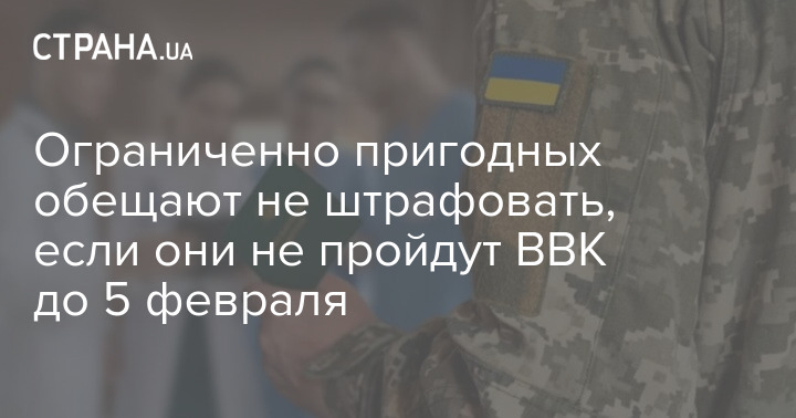 ТЦК та СП не штрафуватимуть та оголошуватимуть у розшук обмежено придатних до військової служби громадян, які не встигнуть повторно пройти військово-лікарську комісію до 5 лютого. Військкоматам надішлють відповідну директиву.