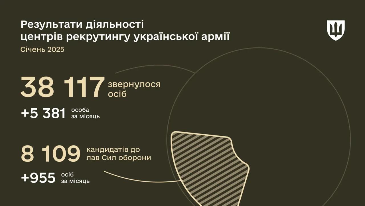 "У січні 2025 року до центрів звернулися 5 381 особа, що майже на 80% більше середньомісячного показника минулого року. Протягом січня кількість кандидатів, які розпочали процес вступу до армії, зросла на 955 осіб і досягла 8 109 осіб", - йдеться у повідомленні..