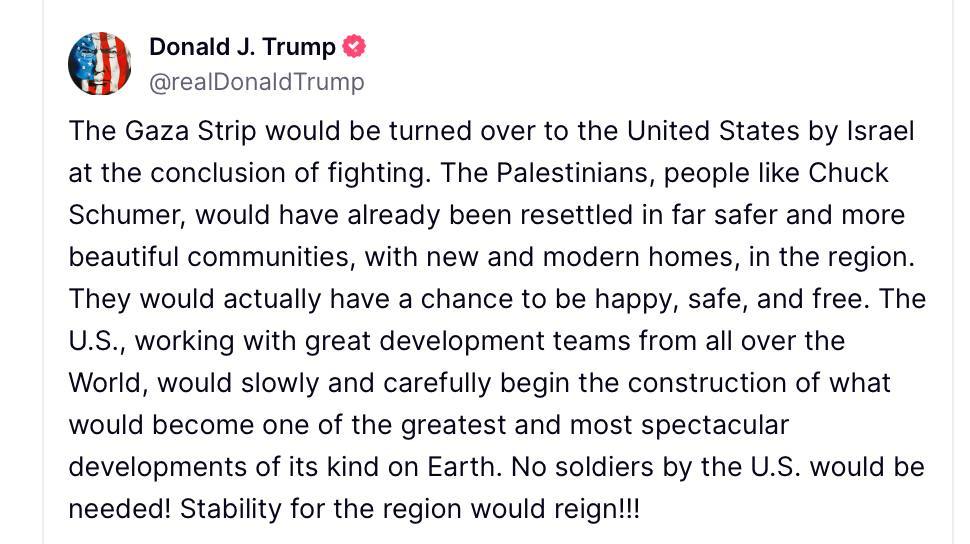 Трамп пише, що "сектор Газу буде переданий США Ізраїлем після завершення бойових дій", а палестинців переселять "в набагато безпечніші та красивіші громади, з новими та сучасними будинками", у них з'явиться "шанс бути щасливими, у безпеці та вільними".