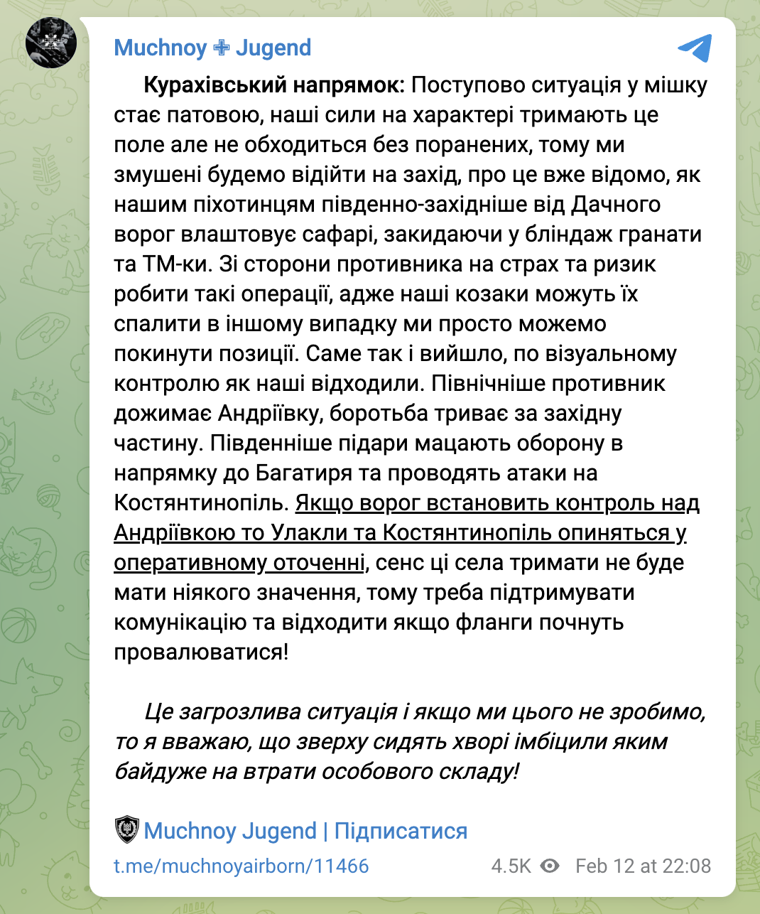 "Якщо ворог встановить контроль над Андріївкою, то Улакли і Константинополь виявляться в оперативному оточенні, сенс тримати ці села не буде мати ніякого значення, тому треба підтримувати комунікацію і відходити, якщо фланги почнуть провалюватися. Це загрозлива ситуація і якщо ми цього не зробимо, то я вважаю, що згори" додав військовослужбовець.