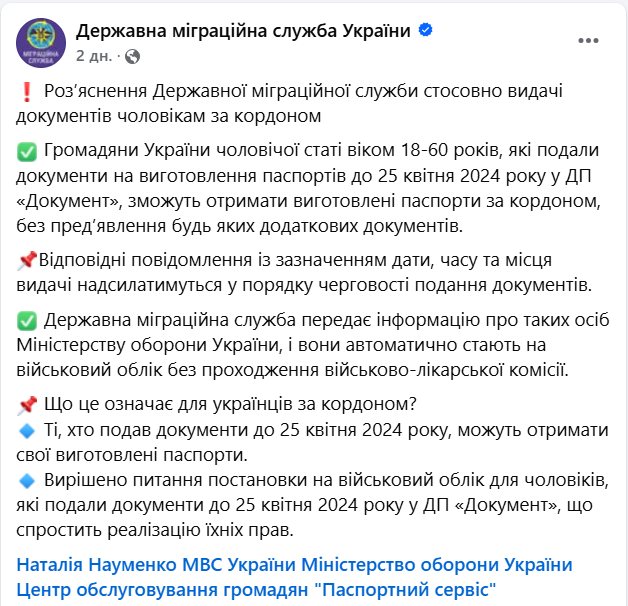 "Громадяни України чоловічої статі віком 18-60 років, які подали документи на виготовлення паспортів до 25 квітня 2024 року у ДП "Документ", зможуть отримати виготовлені паспорти за кордоном, без пред'явлення будь-яких додаткових документів", - йдеться у повідомленні.