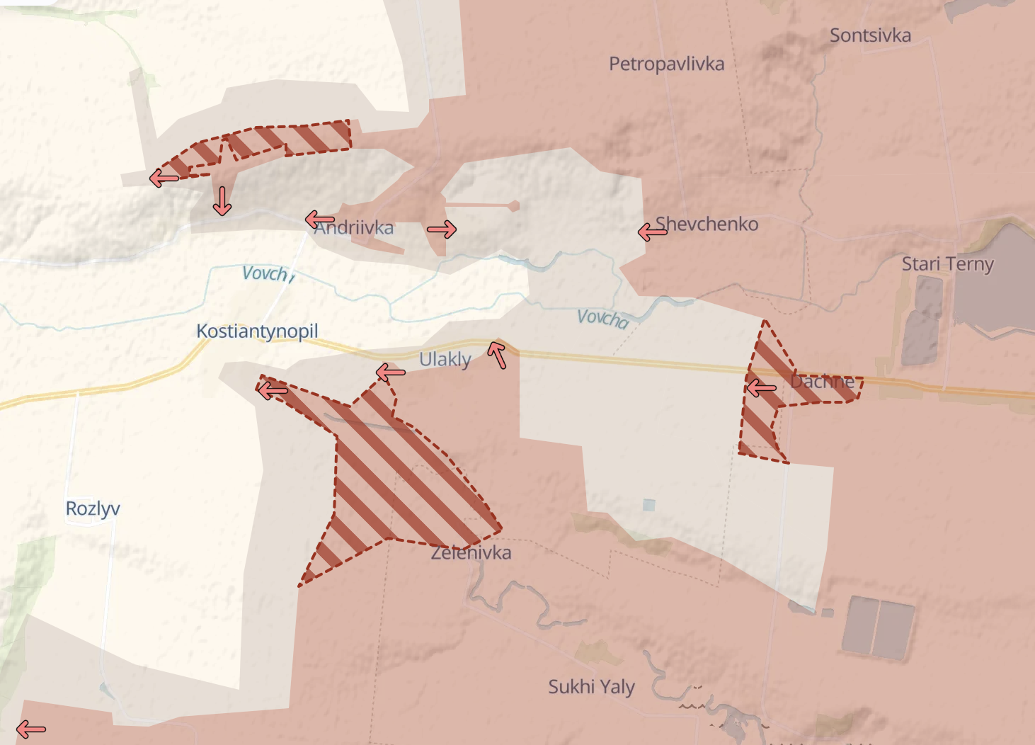 Триває настання РФ і з боку Великої Новосілки. На захід від неї росіяни захопили половину села Новосілка, розширили плацдарм на правому березі річки Мокрі Яли і просунулися на схід - у Новотлустуватий.