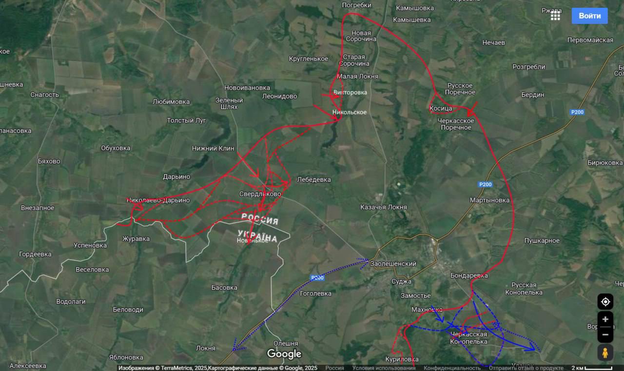 За інформацією російських телеграм-каналів, захід у Сумську область здійснювався від села Свердликове в Курській області (як стверджує Міноборони РФ, днями воно було повернено під російський контроль) у напрямку на села Новеньке та Басове в Сумській області. Вони наголошують, що метою росіян є перерізання траси на Суджу.