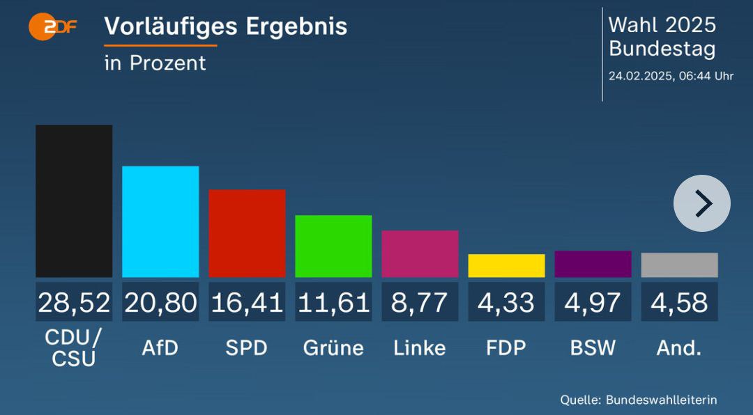 Учора у ФРН відбулися парламентські вибори. На них перемагає блок ХДС/ХСС Фрідріха Мерца - 28,52%. На другому місці права "Альтернатива для Німеччини" – 20,8%. Вона має найбільший приріст порівняно з минулими виборами - 10,4%.
