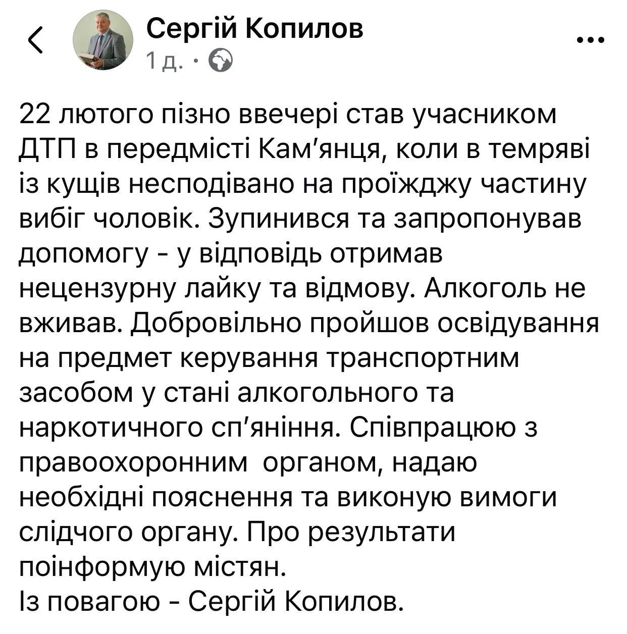 На своїй сторінці у Facebook він розповів про подію та спробував виправдатися. За його словами, 22 лютого, коли він їхав машиною, "у темряві з кущів несподівано на проїжджу частину вибіг чоловік". Копилов повідомив, що "зупинився і запропонував допомогу, на що у відповідь отримав нецензурну лайку та відмову". Він запевнив, що на момент наїзду був тверезий, а зараз сприяє розслідуванню аварії.
